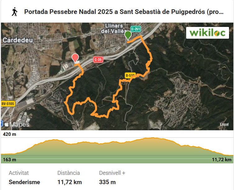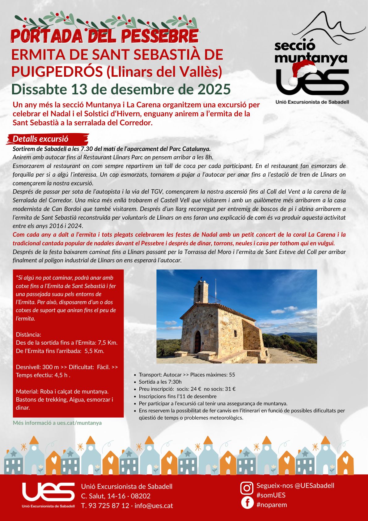 Cada any acabem les activitats de la secció amb la Portada del Pessebre. Aquest any seguirem la tradició portant el pessebre al Ermita de Sant Sebastià de Puigpedrós, al municipi de Llinars del Vallès.