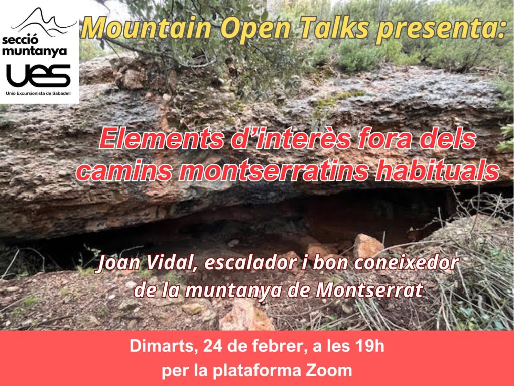 Seguint amb el cicle de Xerrades obertes sobre temes de muntanya i tecnologies aplicables a la muntanya (Mountain Open Talks), corresponent al 1er trimestre de 2026, oferim la sessió que porta per títol Elements d’interès fora dels camins montserratins habituals, presentada per el Joan Vidal, escalador i bon coneixedor de la muntanya de Montserrat.