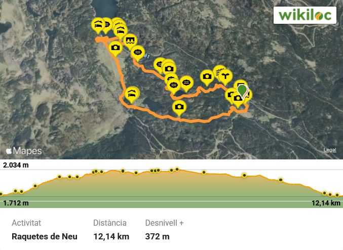 Sortida de raquetes de neu des de l’aparcament dels Avellans. Iniciem la ruta directament amb raquetes, aquest any tenim molta neu i és súperagradable. Ruta circular des de Pla dels Avellans, l’estat de la neu es perfecte, caminem a bon ritme, el primes llac és el Negre, passem pel mig perquè hi ha un bon gruix de gel, tot un goig i amb un paisatge espectacular, més endavant arribem al Estany Llarg que també el creuem pel mig, el tercer l’Estany El Racó. Caminant a prop del riu Tet creuem pel pont de Llívia a l’altre costat i per un camí al mig del bosc arribem al Refuge de les Bouilloses, el pas següent és creuar la presa a l’altre costat i ens dirigim al Refugi Le Bornes Hores on fem un descans per menjar, l’establiment és tancat, però trobem un lloc sense neu per seure còmodes, després d’una aturada i tertúlia molt agradable decidim continuar, ara tot el recorregut és en descens, per a una vall ampla arribem al refugi i estany de la Pradella, un paisatge espectacular, la resta de la ruta és per una pista còmode, trobem el telecadira dels Avellans, ara només resta arribar a l’aparcament del Pla dels Avellans que el tenim molt a prop.