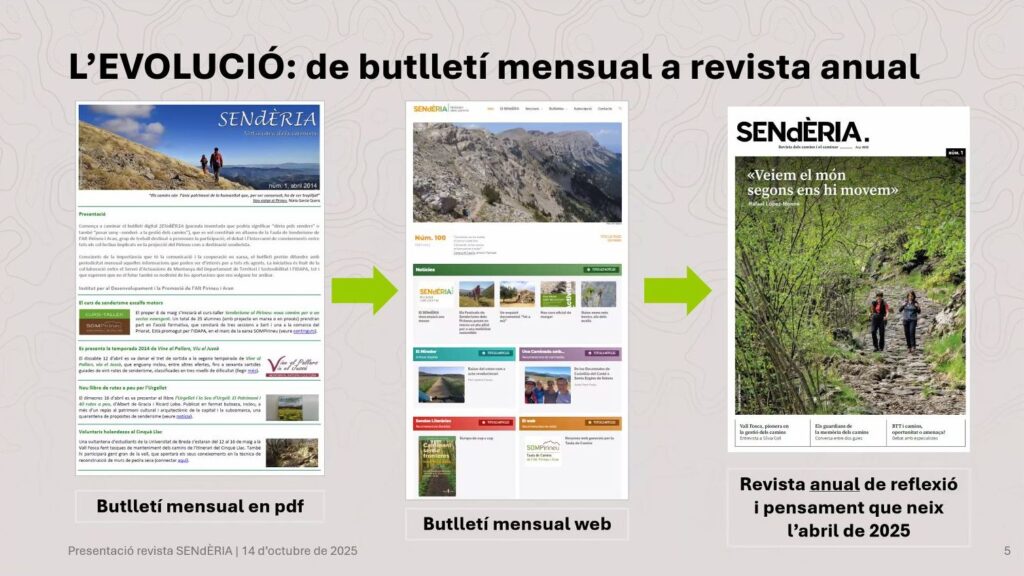 A destacar la frase del número 1: “Els camins és el únic patrimoni de la humanitat que, per serconservar, ha de ser trepitjat”, de la Núria Garcia Quera. El butlletí va evolucionar fins a arribar al número 100 quan ja es va convertir en la revista anual actual, que podeu trobar a Sendèria