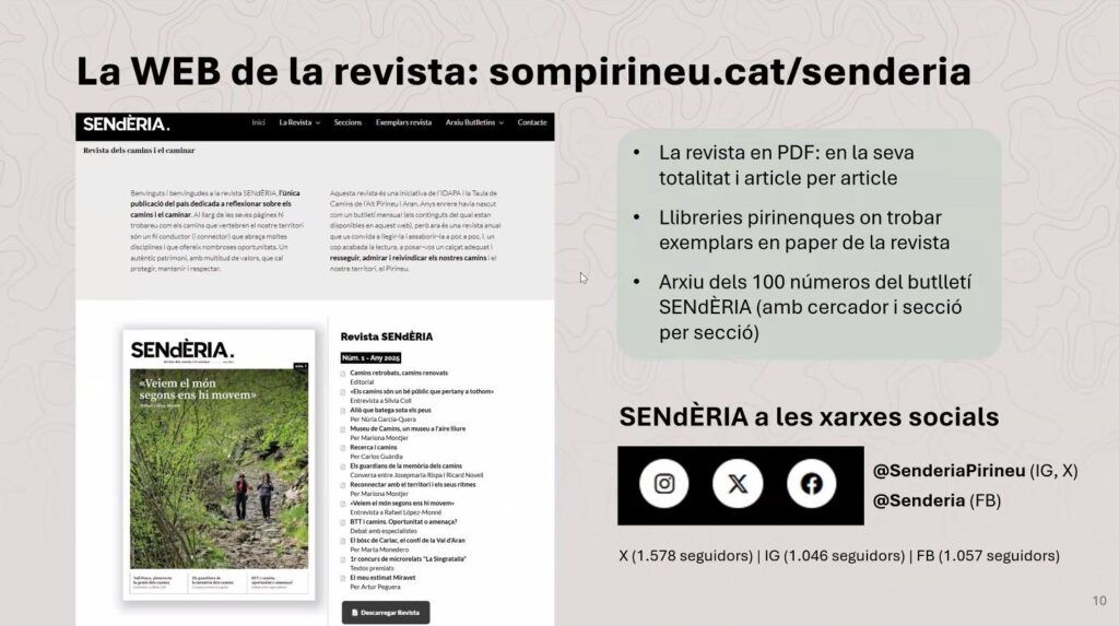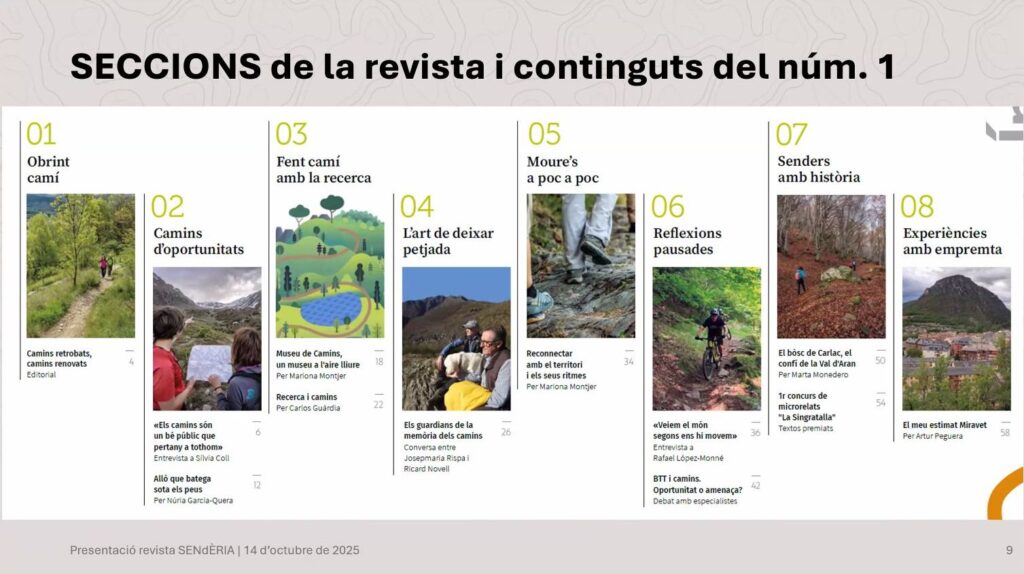 El Xavi Basora va començar la seva intervenció mostrant l’estructura de la revista dividida en 8 seccions encara que en el futur en tindrà 9. Cada secció compta amb articles de tècnics i escriptors que coneixen el medi i els camins. Cal recordar que la revista és accessible electrònicament de forma gratuïta, a través de la web de la revista.