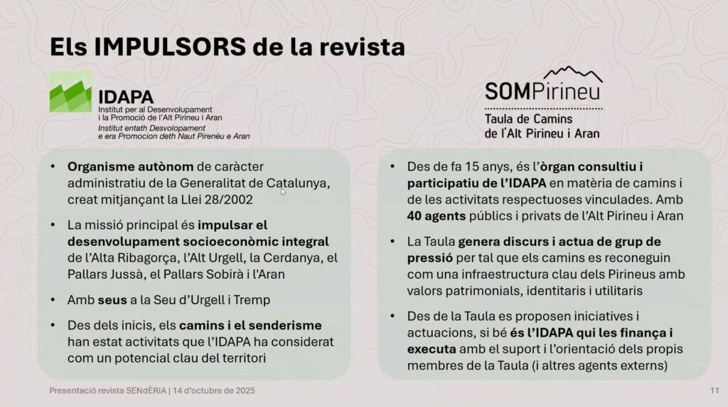 L’edició de la revista és possible gràcies a la IDAPA (Institut per al desenvolupament i la promoció de l’Alt Pirineu i l’Aran), organisme autònom de la Generalitat de Catalunya, amb seus a la Seu d’Urgell i Tremp, la Taula de Camins de l’Alt Pirineu i l’Aran, òrgan consultiu i participatiu de l’IDAPA, format per 40 agents públics i privats de l’Alt Pirineu i l’Aran.