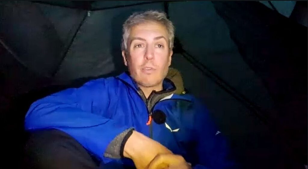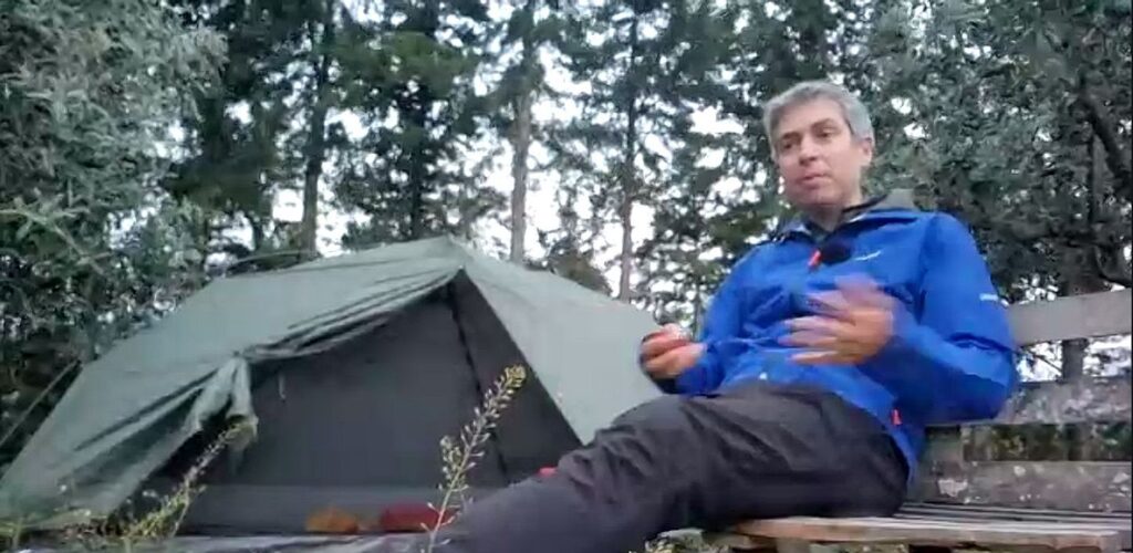 - L’Enric utilitza equipatge de travessa amb una tenda canadenca que no pesa més 1 kg, tal com es pot veure al vídeo. Per cert que va començar la connexió des de fora la tenda però hi va haver d’entrar ja que es va posar a ploure. Porta a l’esquena uns 7,5 kg de pes, sense comptar el menjar i la beguda.