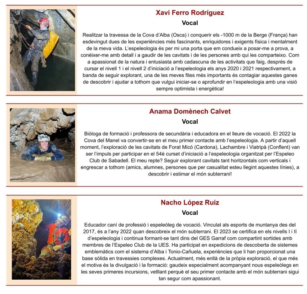 En totes i cadascuna d’aquestes activitats, a més de l’exploració i el treball en equip, també fomentem el respecte pel medi ambient, la conservació del patrimoni subterrani i la divulgació del coneixement espeleològic. Per nosaltres, l’espeleologia és molt més que un esport: és una manera de descobrir i comprendre millor el nostre entorn natural i promoure així el respecte i l’estima vers ell.