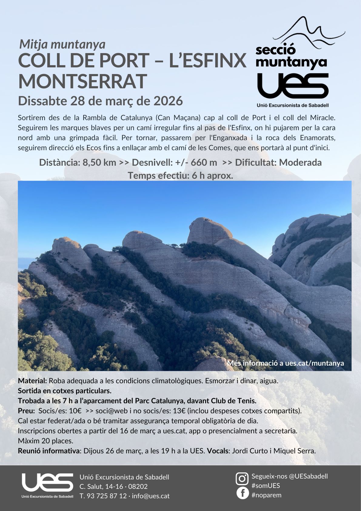 Per contactar amb nosaltres pots enviar un correu a l’adreça de la secció muntanya@ues.cat o bé trucar a la UES (Telèfon: 93 725 87 12).